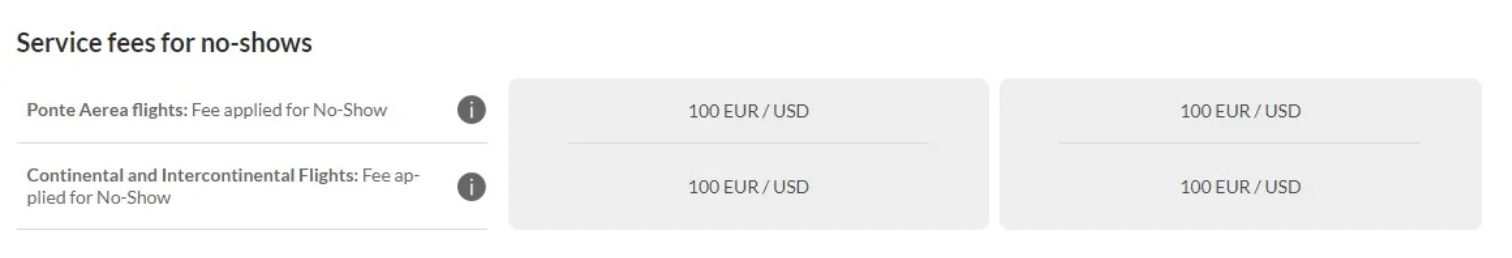 Old Service fees for using the TAP Mile & Go Assistance Center or TAP counters: