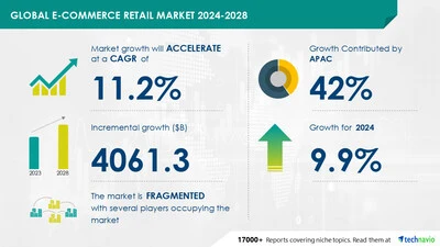 GLOReport with the AI impact on market trends – The global E-commerce retail market size is estimated to grow by USD 4.06 trillion from 2024-2028, according to Technavio. The market is estimated to grow at a CAGR of 11.2% during the forecast period. The advent of personalized shopping is driving market growth, with a trend towards integration of AI. However, strict regulatory policies related to compliance and customer protection poses a challenge.Key market players include Alibaba Group Holding Ltd., Amazon.com Inc., Apple Inc., Best Buy Co. Inc., Blink Commerce Pvt. Ltd., Coupang Inc., eBay Inc., Etsy Inc., Flipkart Internet Pvt. Ltd., Inter IKEA Holding BV, Manash E-Commerce Pvt. Ltd., Nykaa E-Retail Ltd., Otto GmbH and Co. KG, Rakuten Group Inc., Reliance Retail Ltd., Shopify Inc., Snapdeal Ltd., Target Corp., The Kroger Co., and Walmart Inc..