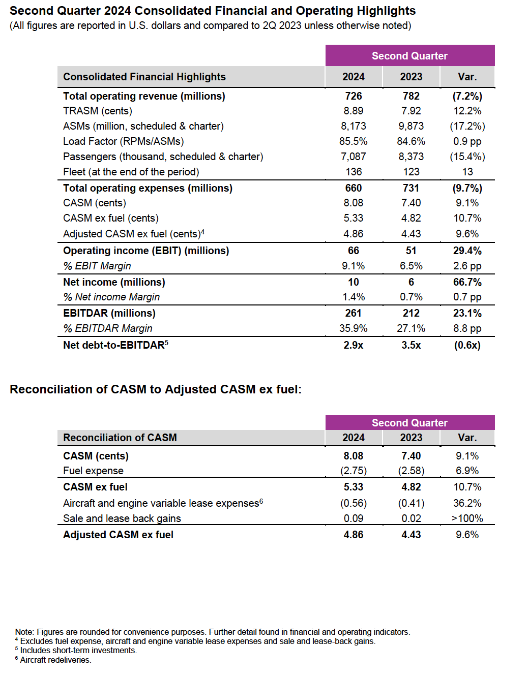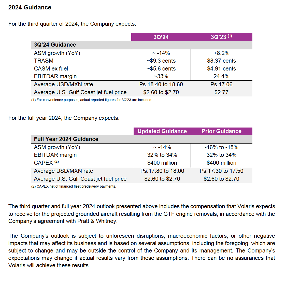 Enrique Beltranena, President & Chief Executive Officer, said: “Volaris continues to perform positively, achieving our highest absolute EBITDAR for a second quarter despite the fleet groundings due to accelerated engine inspections. Volaris’ unwavering focus on execution and efficient cost control has enabled us to deliver strong results. Our mitigation plan is on track with favorable outcomes, and we have largely achieved our goals since the inspections began. In fact, we are improving our full-year ASM guidance to -14%3. We currently have a well-balanced market mix, with an increased presence in the cross-border market that has strengthened our TRASM, and our booking curves indicate ongoing robust performance for the summer high season.